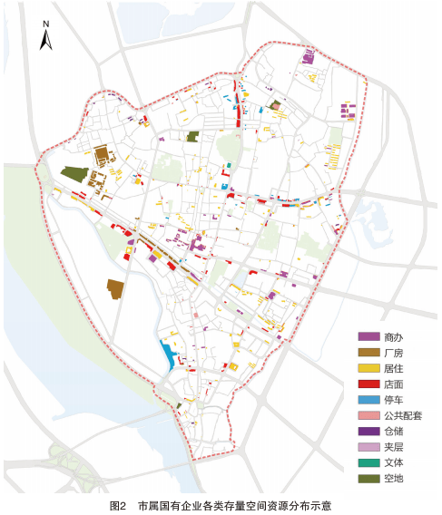 泉州古城内分布有大量的国有企事业单位低效建设用地及地上建(构)筑物,是现阶段处理历史城区空间资源配置矛盾的重要资源。仅市属国有企业所持有的低效建筑物总面积就达到75.97万m2,其中具有独立用地的建筑面积占比43%,非独立用地的建筑面积占比57%。该部分存量空间资源类型庞杂,分布分散(图2)。其中,资产闲置约8.78万m2,约占国有资产总量的12%,其余处于出租、自用或占用状态,空间利用效率和产出效能较低。若能充分发挥市属国有企业低效建设用地及地上建(构)筑物空间价值,补足各类空间需求缺口、优化历史城区功能布局和空间资源配置,将创造可观的经济价值和社会效益。若能破除障碍实现资产化,创造的土地出让收益将达到20亿~30亿。