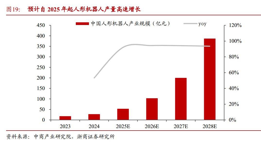 随着商业化步伐持续加快,2025 年或将成为人形机器人批量生产元年。2023 年,国家 层面发布了《人形机器人创新发展指导意见》,明确提出到 2025 年实现批量生产,2027 年 相关产品深度融入实体经济的目标。据中商产业研究院预测,至 2025 年,中国人形机器人 市场规模将达到约 53 亿元,2027 年预计扩大至 200 亿元,2025-2027 CAGR 为 94%,产业 规模保持高速增长。
